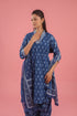 Radiating timeless elegance, this indigo blue cotton kurta set is adorned with intricate handblock prints that reflect artisanal charm. Designed with a flattering V-neckline enhanced by delicate striped detailing, the kurta is paired with matching bottoms and a beautifully patterned dupatta for a complete look. Crafted from soft, breathable cotton, this set combines superior quality with everyday comfort, making it a perfect choice for festive gatherings, casual outings, or relaxed evenings.